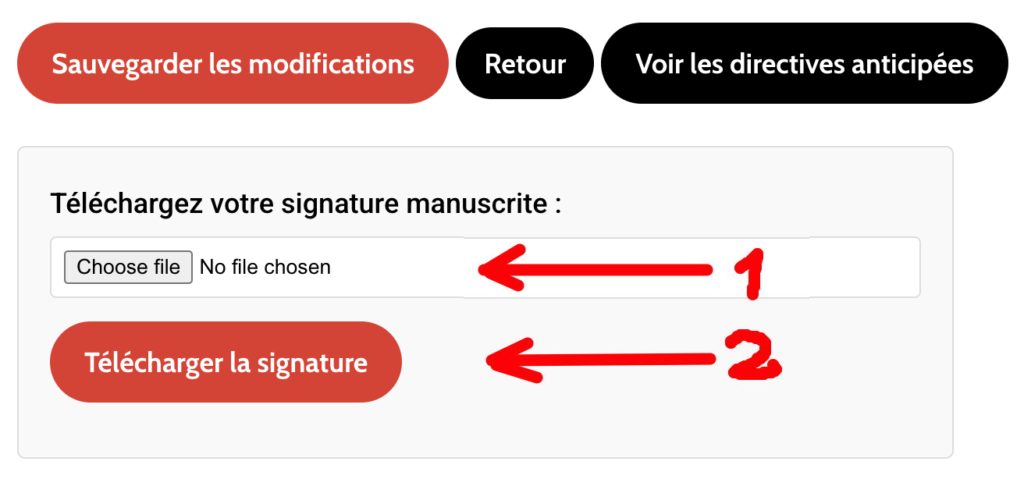Après avoir sauvegardé vos modifications, vous pouvez encore télécharger une signature scannée. Pour ce faire, sélectionnez le fichier qui contient votre signature (1, Choose file) et appuyez sur « Télécharger la signature (2) ».